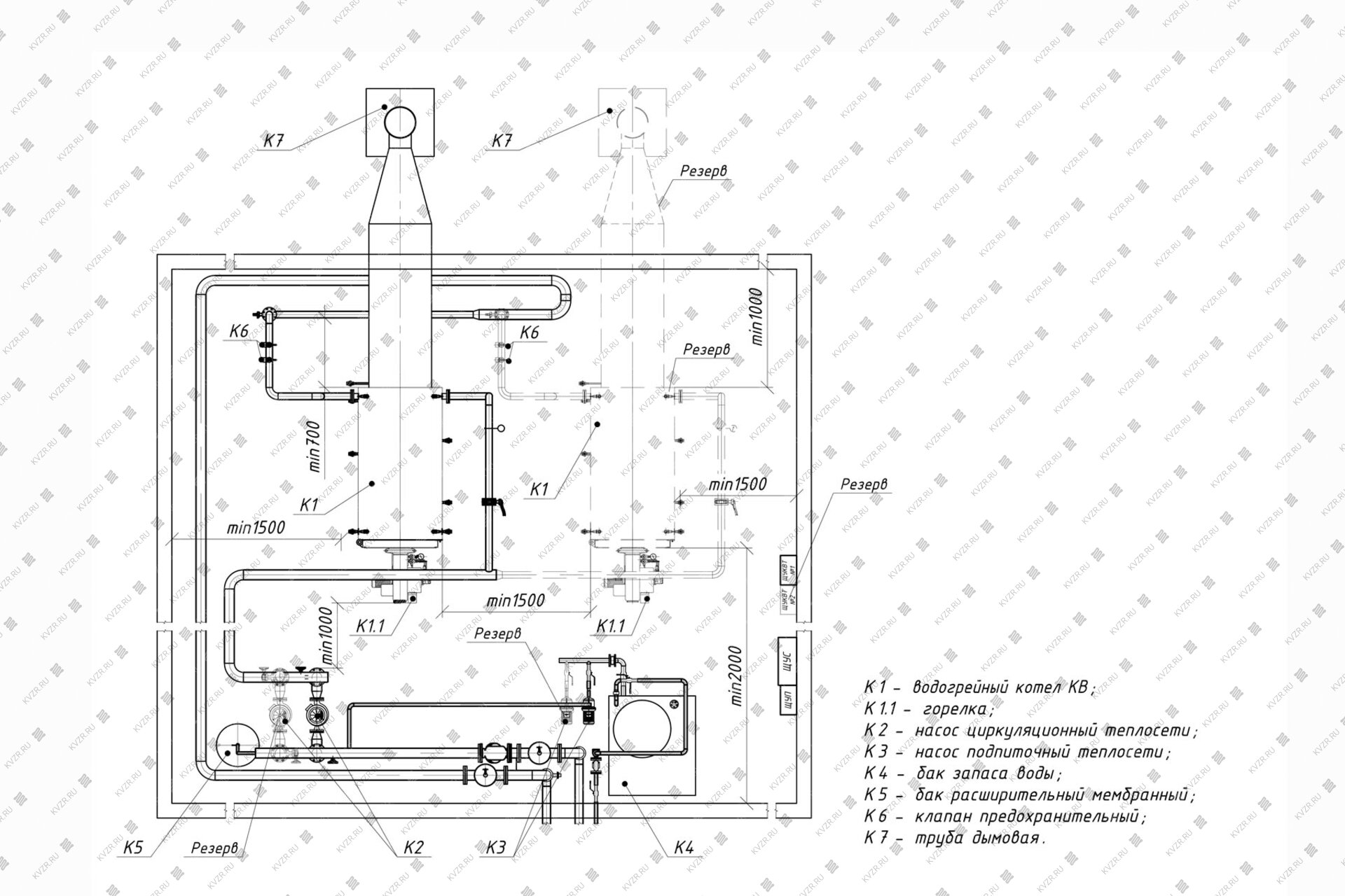 Чтобы правильно подключить котел КВа 1,25 в котельной необходимо оставить проемы для обслуживания оборудования во время эксплуатации. На представленной здесь схеме указаны их минимальные размеры. Кроме того, в данной примерной схеме монтажа водогрейных котлов и оборудования указан перечень минимально необходимого вспомогательного оборудования для правильной работы котла.