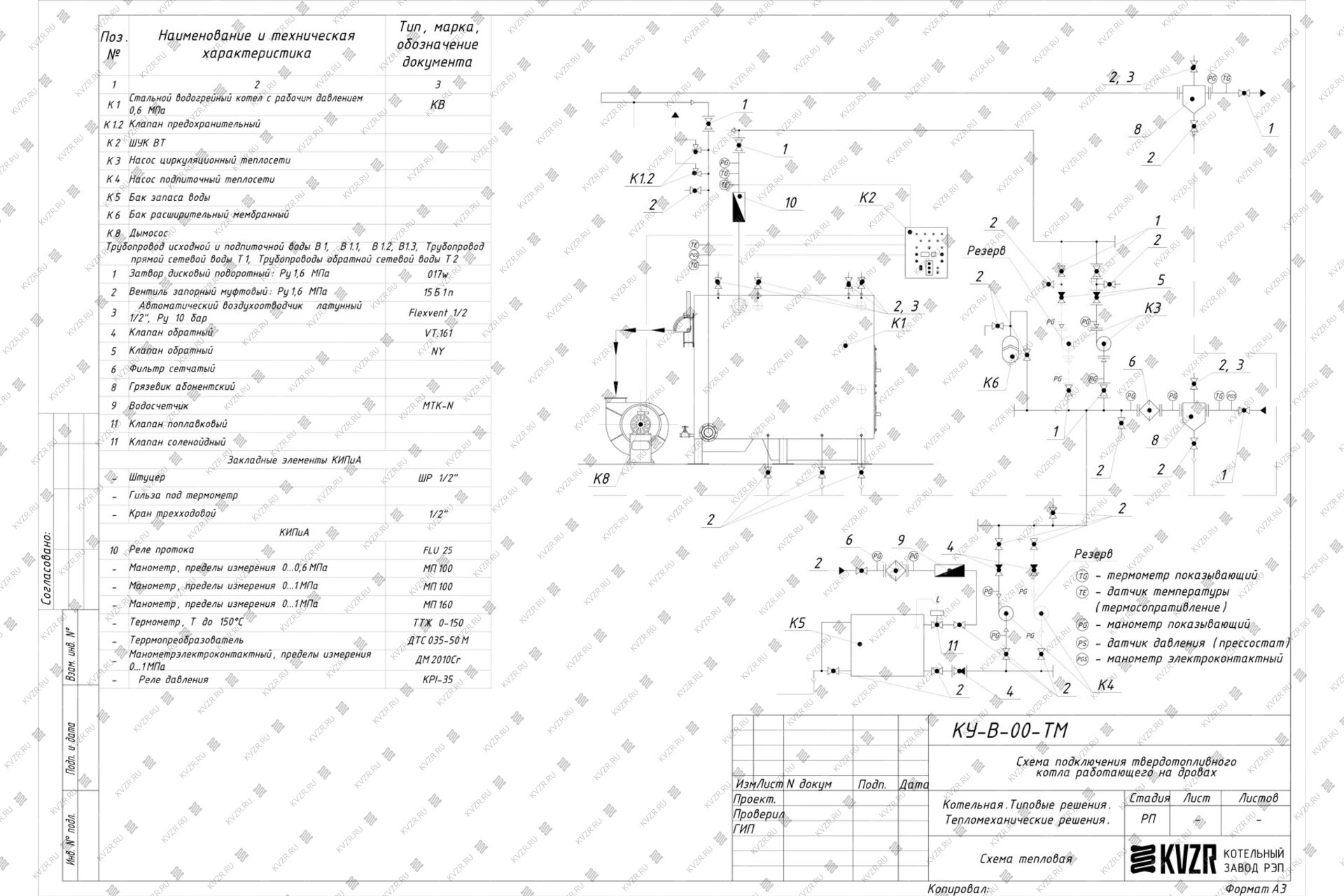 Образец тепловой схемы подключения оборудования в котельной приведен на данной схеме. При эксплуатации очень важно грамотно осуществить подключение оборудования, установить все контрольно измерительные приборы, для контроля параметров работы котельной и запорную арматуру для оперативного переключения потока теплоносителя при плановой или аварийной остановке оборудования. Данную схему можно использовать как пример для разработки под свой объект или заказать у нас разработку индивидуальной схемы для вашей котельной.