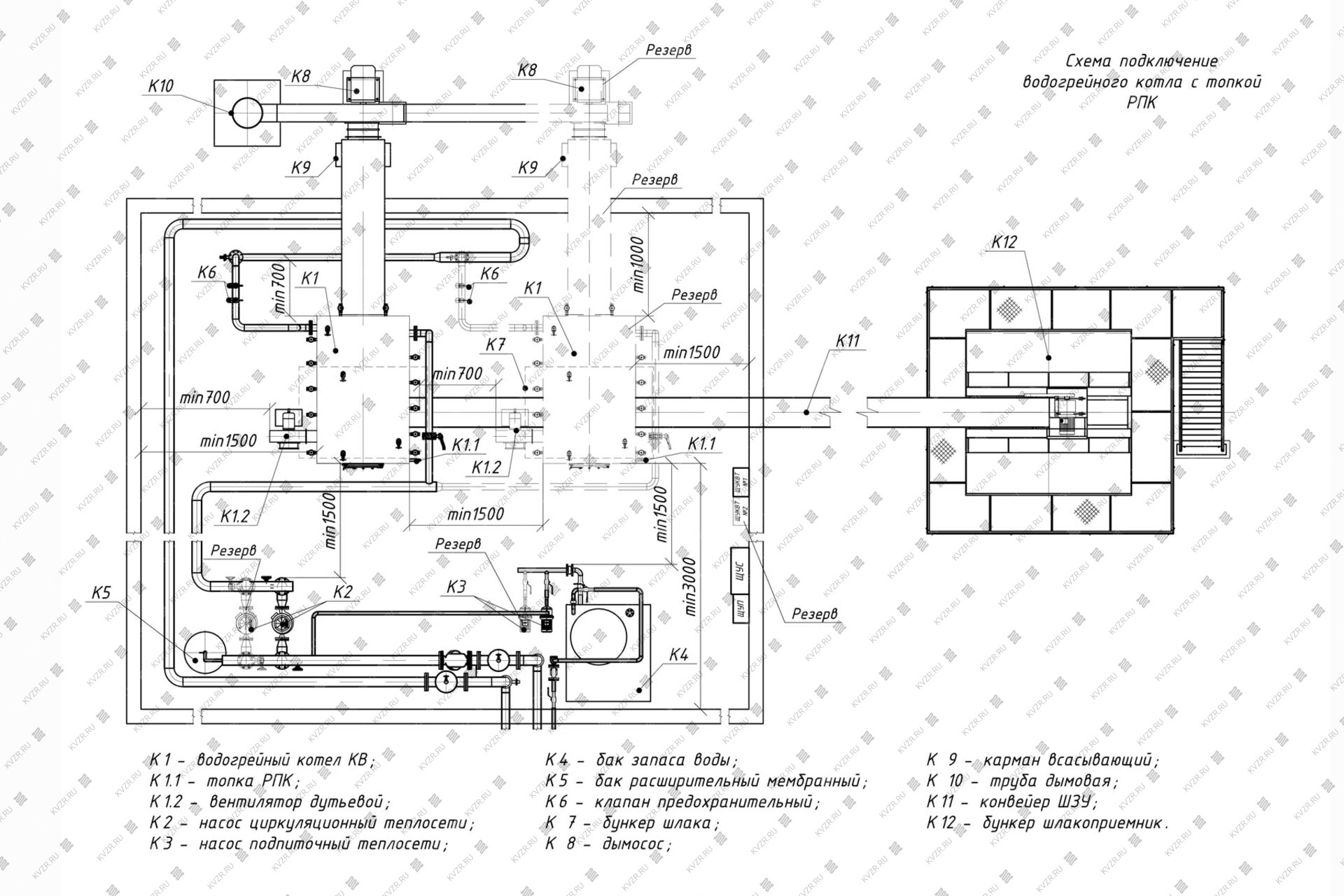 Чтобы правильно подключить котел КВм-0.5 с топкой РПК в котельной необходимо оставить проемы для обслуживания оборудования во время эксплуатации. На представленной здесь схеме указаны их минимальные размеры. Кроме того, в данной примерной схеме монтажа водогрейных котлов и оборудования указан перечень минимально необходимого вспомогательного оборудования для правильной работы котла.