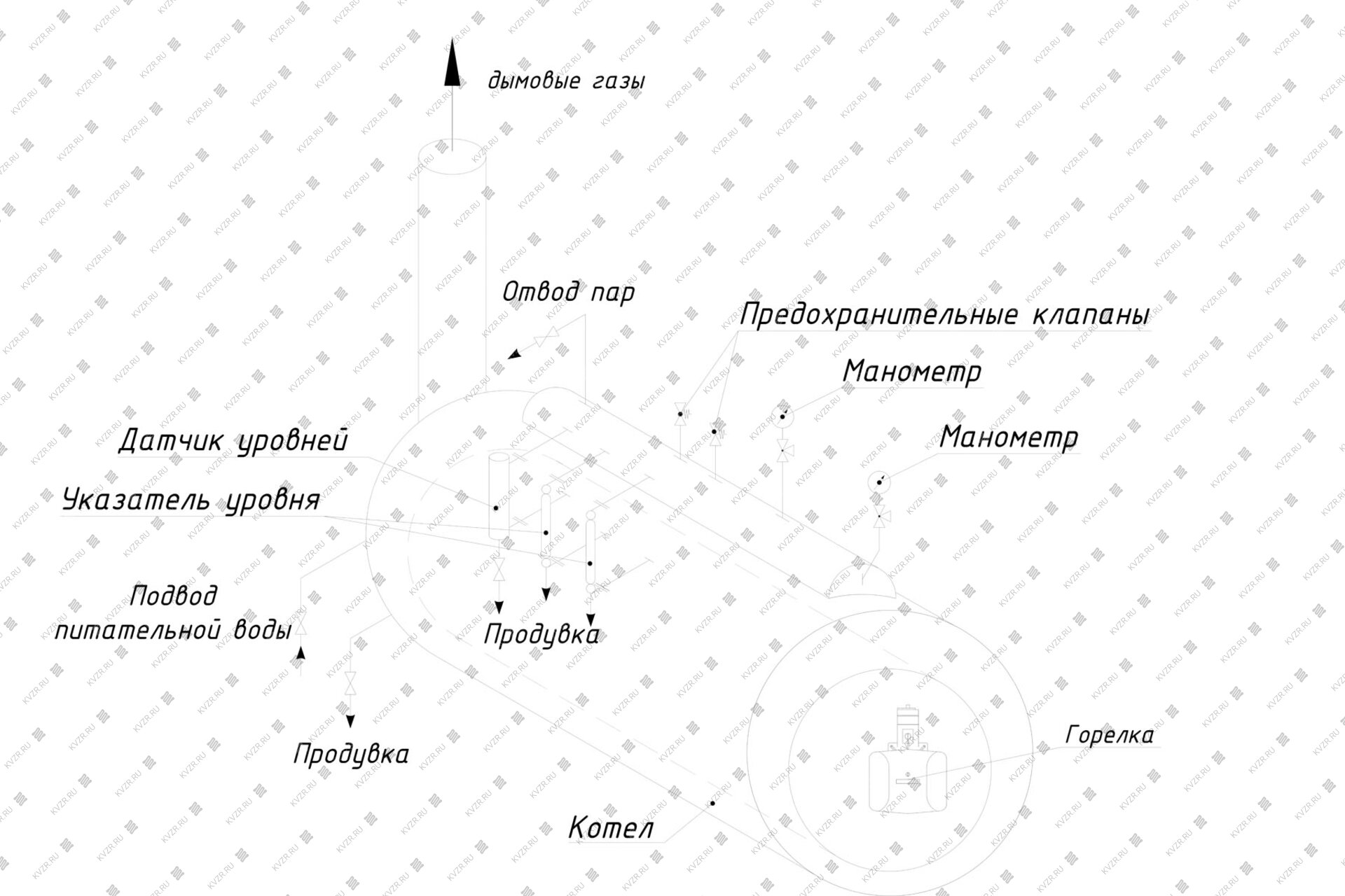 Паровые котлы 1000 кг 130 °С на дизеле комплектуются манометром, водомерной колонкой с водомерным стеклом, двумя предохранительными клапанами, паровыми и продувочными вентилями.